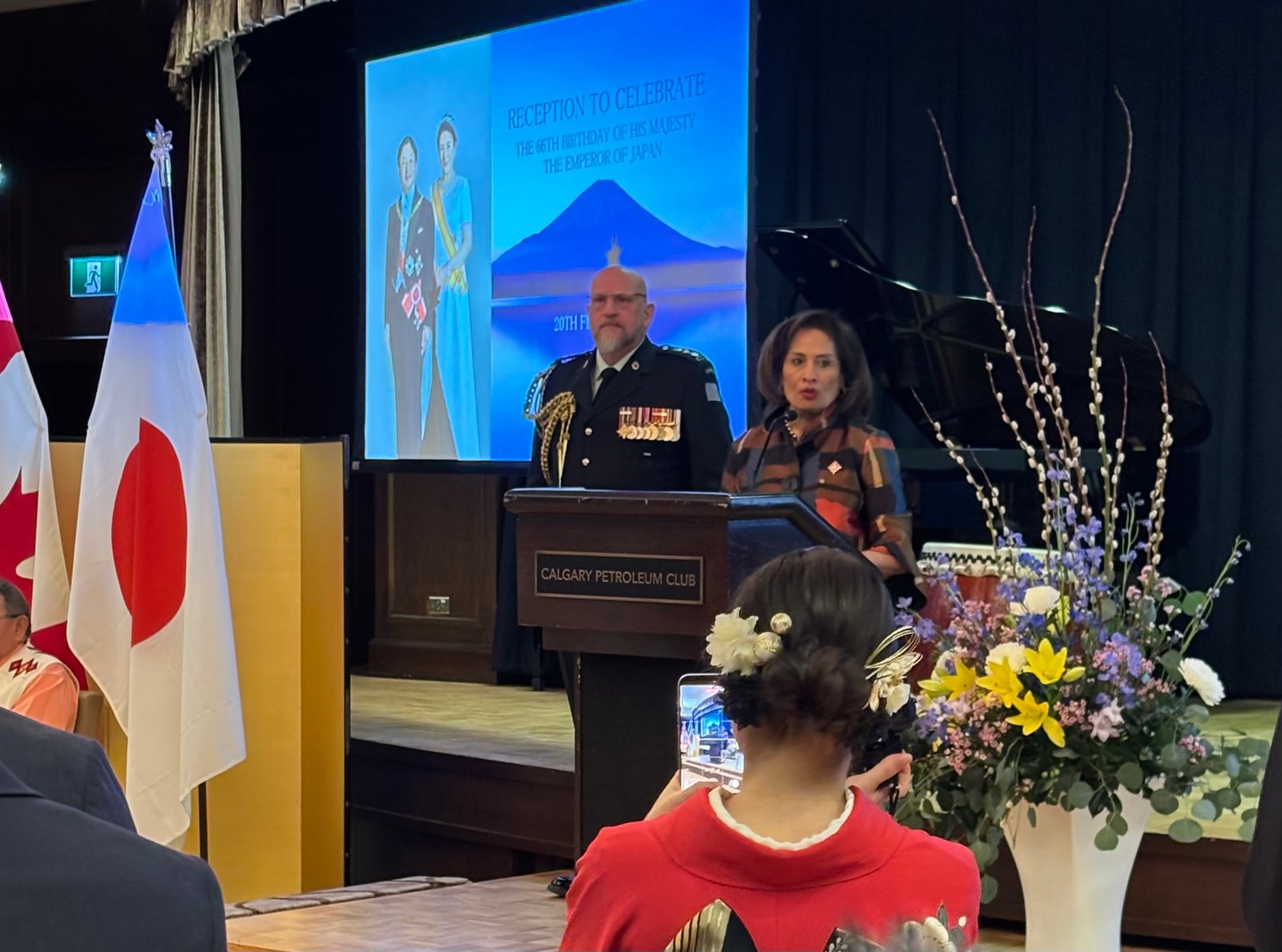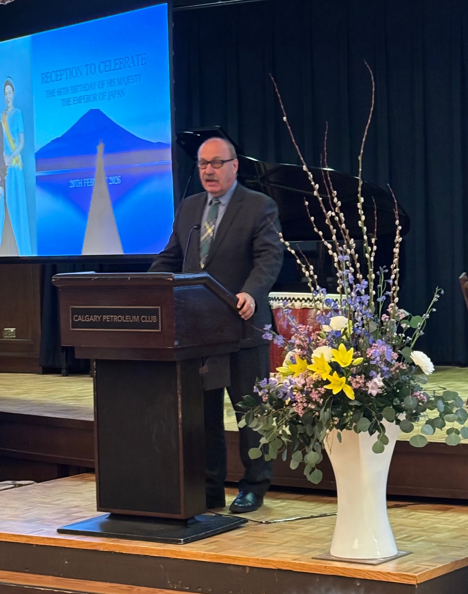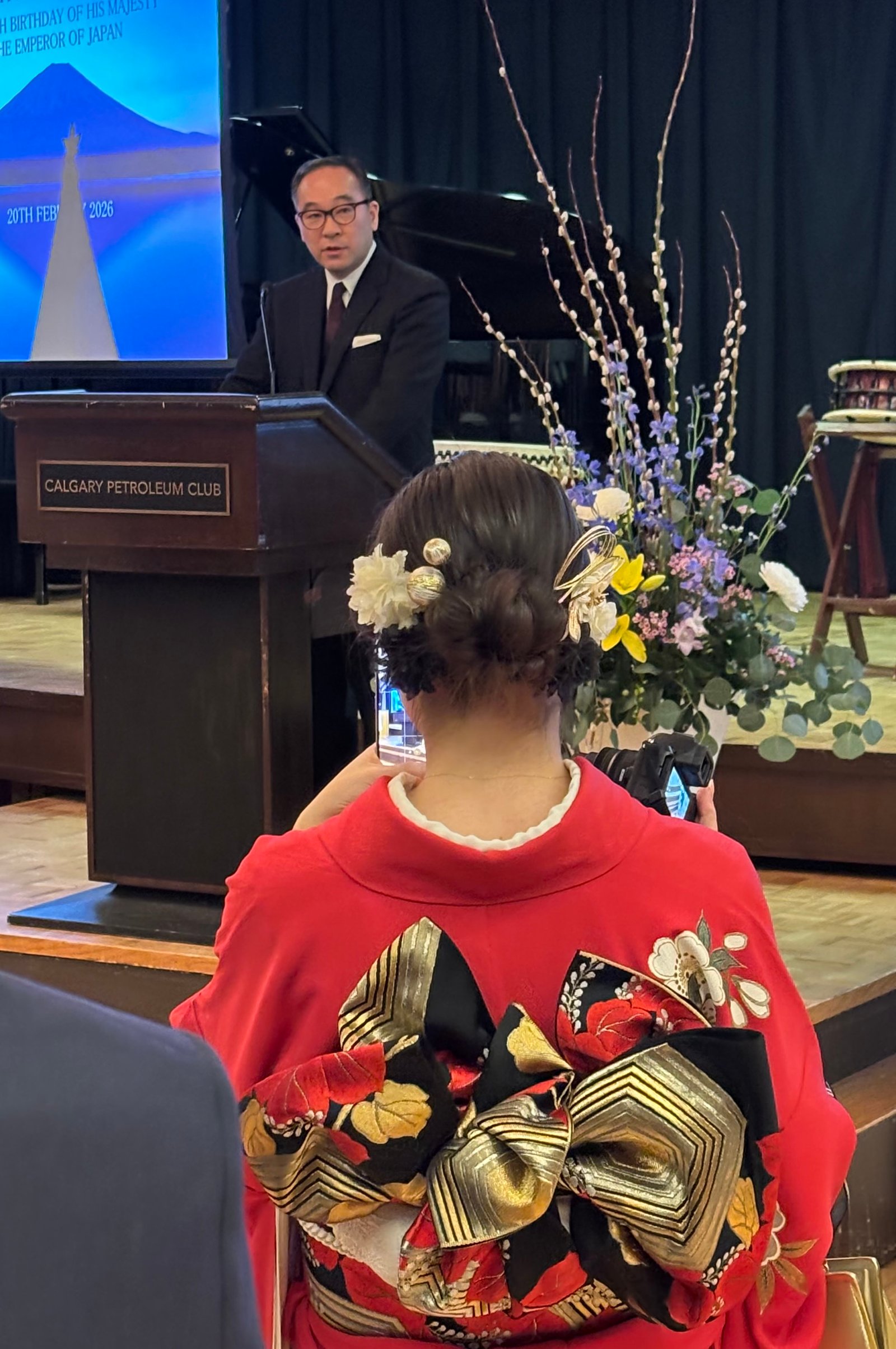 On February 20th we were invited to celebrate the 66th birthday of the Emperor of Japan's birthday. The ceremony was hosted by a Consulate-General of Japan, Calgary, Mr. Takehiko Wajima. There were likely 300 in attendance at the venue, The Calgary Petroleum Club.