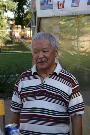11- Next stop was at the Nikka Yuko Japanese Garden. Bob Hironaka conducted the tour, however mother nature was even more prevalent at the garden than usual. Heavy rain, snow, hails and just about everything else began falling from the sky. Putting a damper on the tour, the guests were whisked back to the bus and headed to Bob Hironaka's home where buffalo burgers were being bar-b-qued to perfection. Peggy, Carol, Cheryl and of our chef, Alexander served the guests with our typical gracious hospitality and tasty food. Media from television and the Lethbridge Herald attended and conducted interviews. The reports were broadcast on two television stations and an excellent story was published in the Tuesday edition of the Lethbridge Herald.