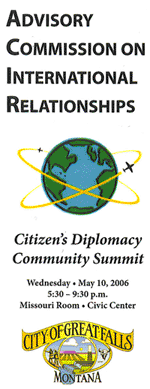 On Wednesday, May 10, 2006 we were invited by Mr. Bob Harris, Chairman of the Advisory Commission on International Relationships to Great Falls, Montana to attend a "Citizen's Diplomacy Community Summit". Carol, Cheryl and Harold made the trip down to Great Falls and participated in the summit.