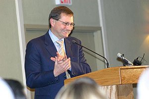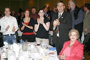 Attendees rise to a standing ovation welcoming the Honorable Ed Stelmach Premier of Alberta.