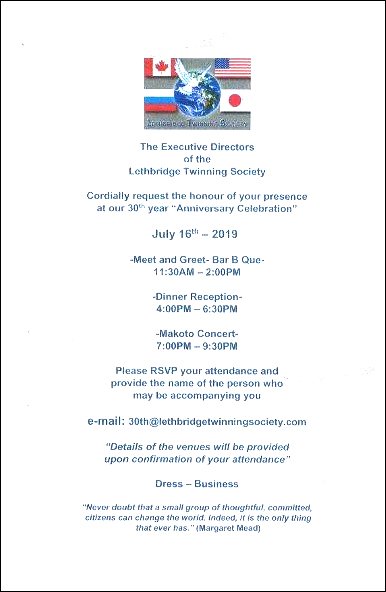 The Lethbridge Twinning Society is celebrating our 30th year anniversary, on July 16th we are having an all day event. The Dinner Reception will be for members and friends of the Lethbridge Twinning Society via invitation only. Please RSVP your attendance.