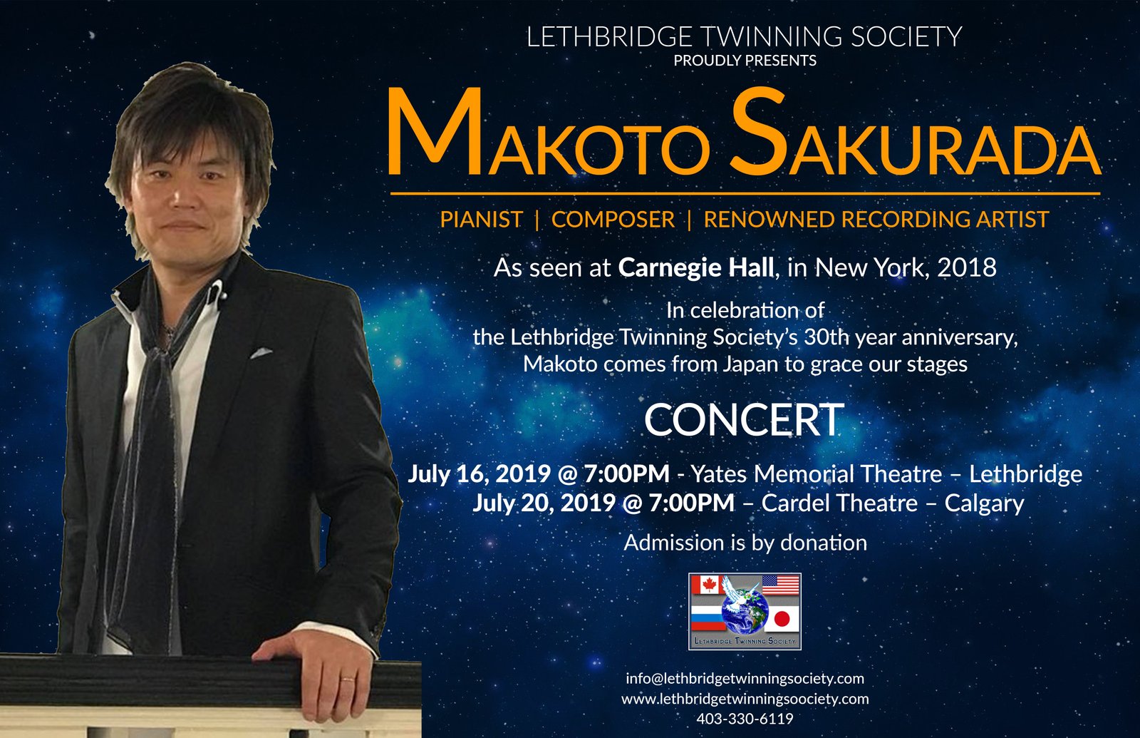 The day will conclude with a magnificent concert to which the public is welcome, featuring Makoto Sakurada from our sister city, Towada City, Japan. The concert will be held at the Yates Memorial Theater at 7:00PM. Admission is by donation. Makoto performs in both English and Japanese. Makoto has been in Alberta two times previously and has performed in over 20 venues across our province.