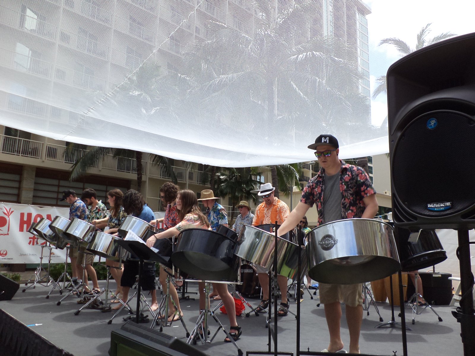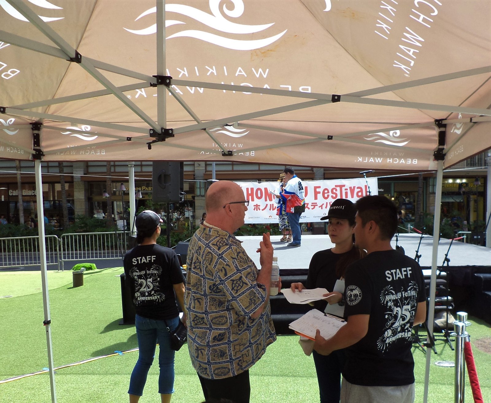 Global Drums Director, Adam Mason discussing the performance details with Honolulu Festival Staff